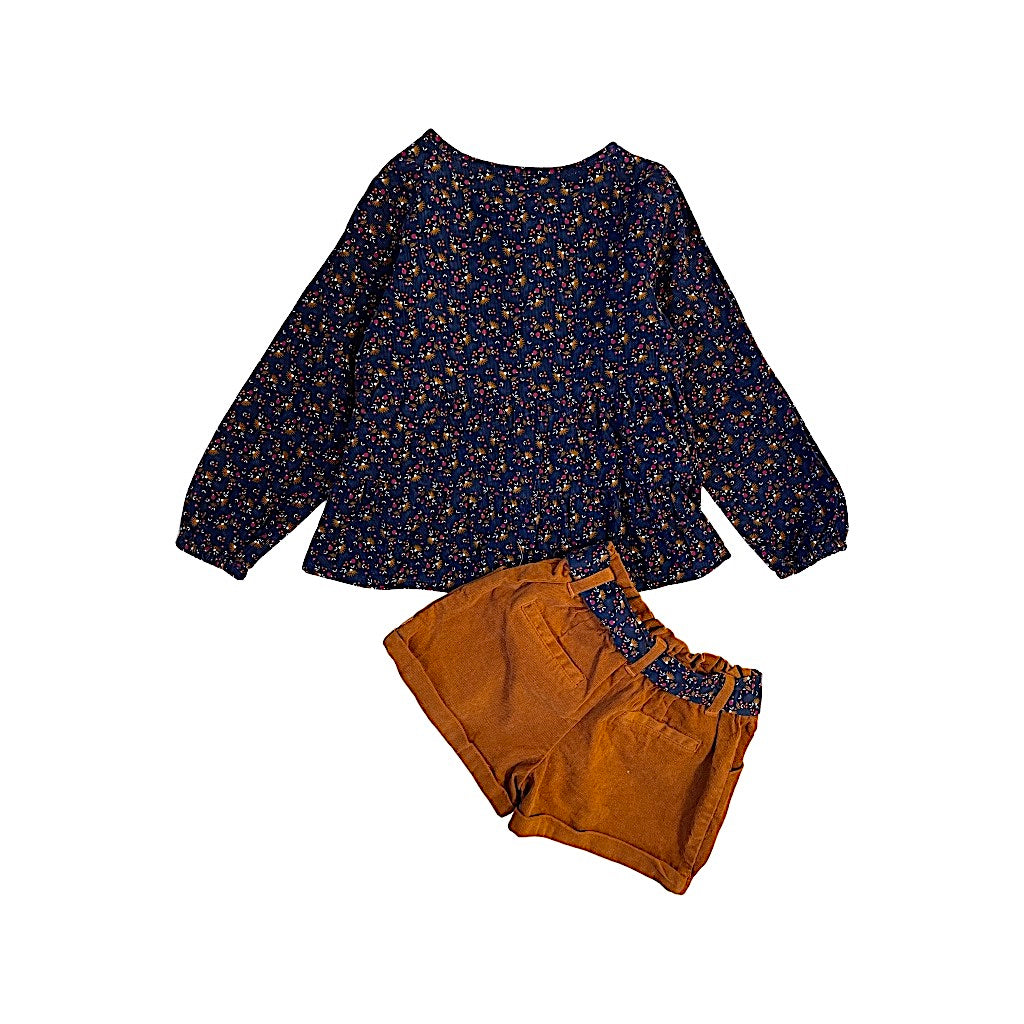Apraksts: "Okaidi" firmas divdaļīgs komplkets. Blūzīte atdarnāma ar spiedpogām; šortu jostas daļa elastīga.