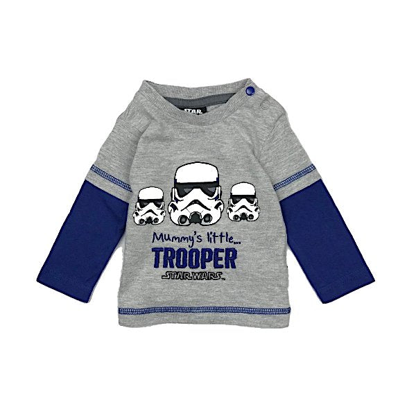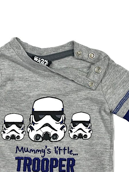 Apraksts: "M&Co" firmas pelēkas un zilas krāsas krekliņš ar krāsainu aplikāciju un uzrakstu "Mummy's little trooper". Kakla daļa atdarināma ar spiedpogām.