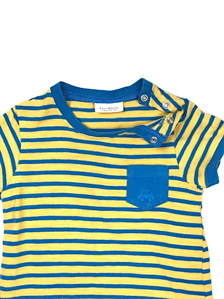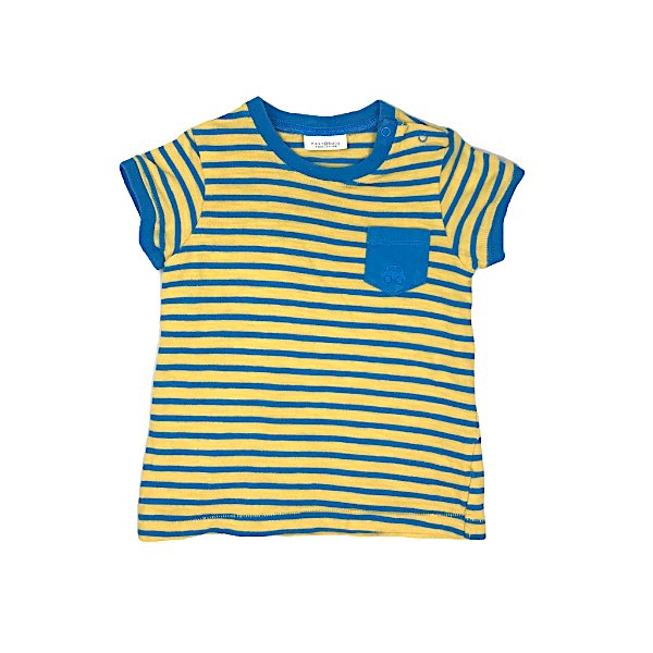 Apraksts: "Next" firmas dzeltens kokvilnas krekliņš ar zilām svītrām. Kakla daļa atdarināma ar spiedpogām.