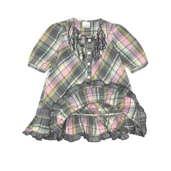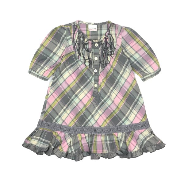 Apraksts: "Next" firmas rūtaina kleitiņa ar volāniņiem. Kakla daļa priekšpusē atdarināma ar pogām