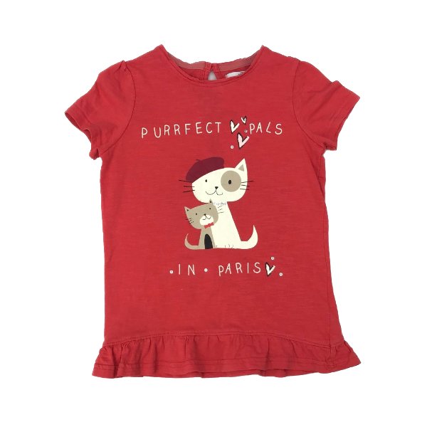 Apraksts: "Marks&Spencers" firmas kokvilnas krekliņš ar kaķīšiem un uzrakstu "Purrfect pals". Kakla daļa aizmugurē atdarināma ar pogu.