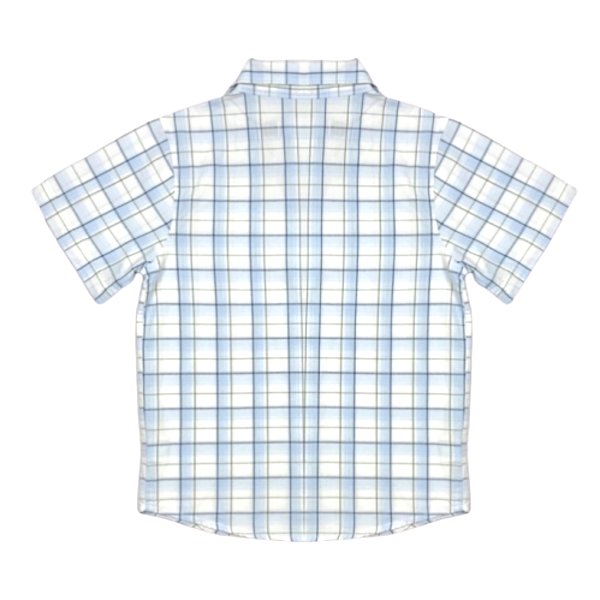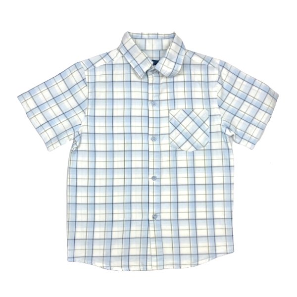 Apraksts: Gaiši zils, rūtains kokvilnas krekls ar īsām piedurknēm. Atdarināms visā garumā ar pogām.