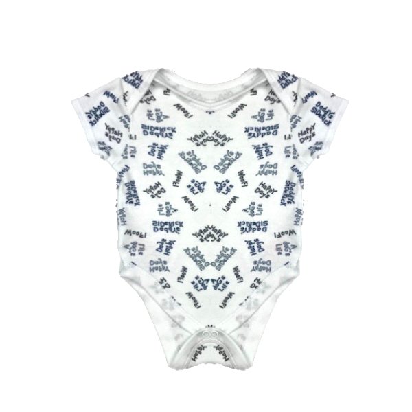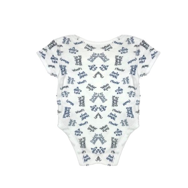 Apraksts: Balts kokvilnas bodijs ar uzrakstiem "Happy days", "Daddy's sidekick".  Apakšdaļa atdarināma ar spiedpogām.