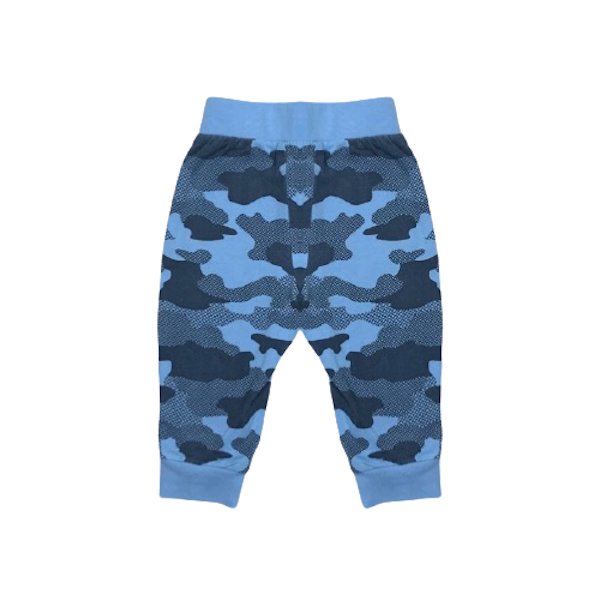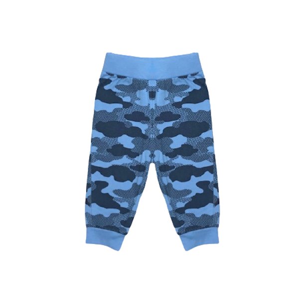 Apraksts: Zilas bikses ar haki apdruku. Bikšu jostas daļa elastīga, komfortablai nēsāšanai.