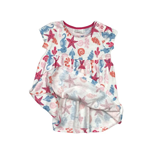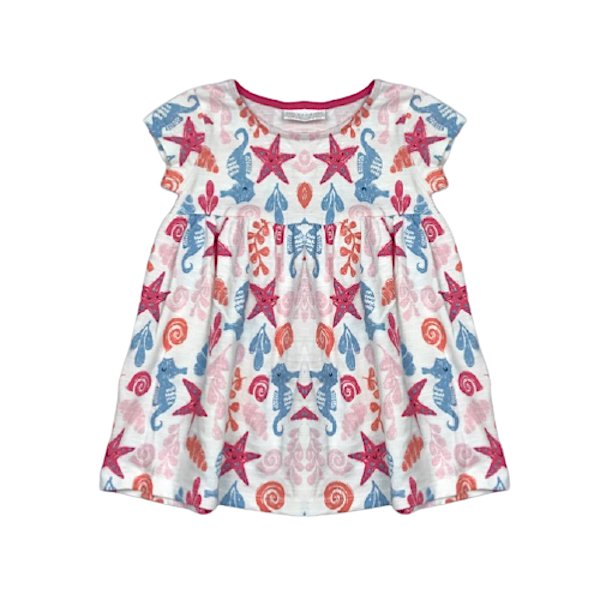 Apraksts: Kokvilnas kleitiņa ar jūras tēmas aplikācijām. Kakla daļa sānā atdarināma ar spiedpogām.