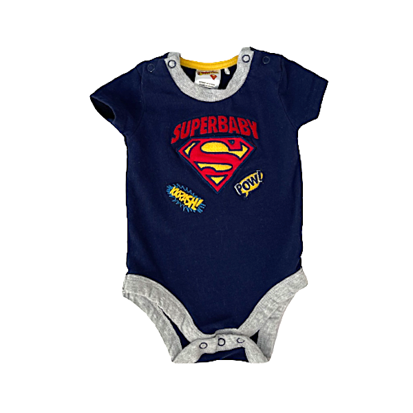 Apraksts: Zils kokvilnas bodijs ar Supermena logo un uzrakstiem. Apakšdaļa un kakla daļa sānos atdarināma ar spiedpogām.