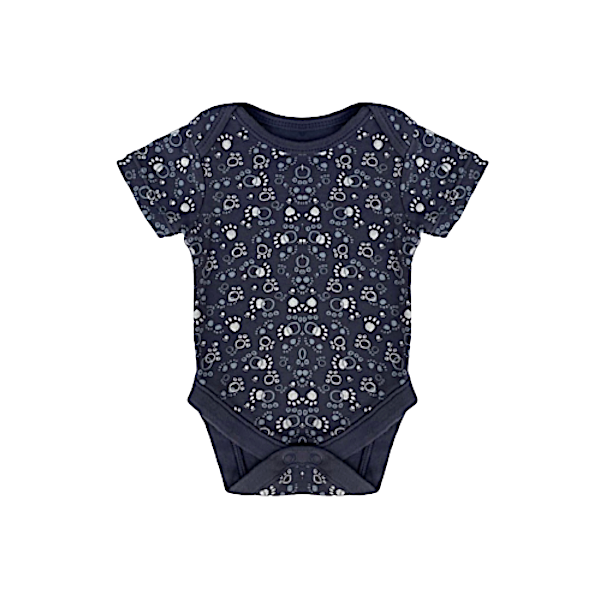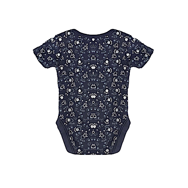 Apraksts: Zils kokvilnas bodijs ar īsām piedurknēm un pēdiņu aplikācijām. Apakšdaļa atdarināma ar spiedpogām.