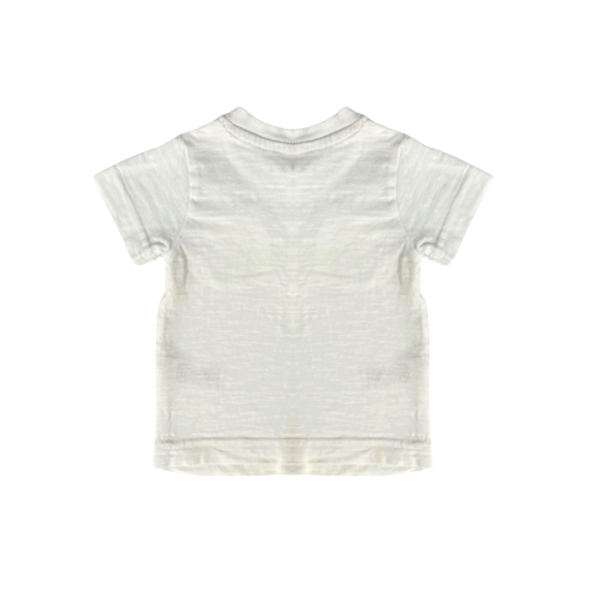 Apraksts: Balts T- krekls ar koka tekstūras podziņām. Kakla daļa atdarināma ar pogām.