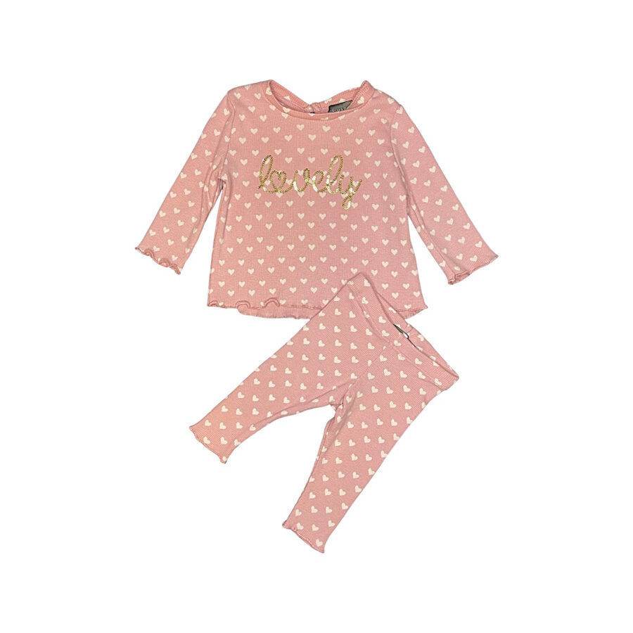 Apraksts: Divdaļīgs kostīms ar uzrakstu un sirsniņām. Krekliņa kakla daļa aizmugurē atdarināma ar pogu. Bikšu jostas daļa elastīga, komfortablai nēsāšanai.