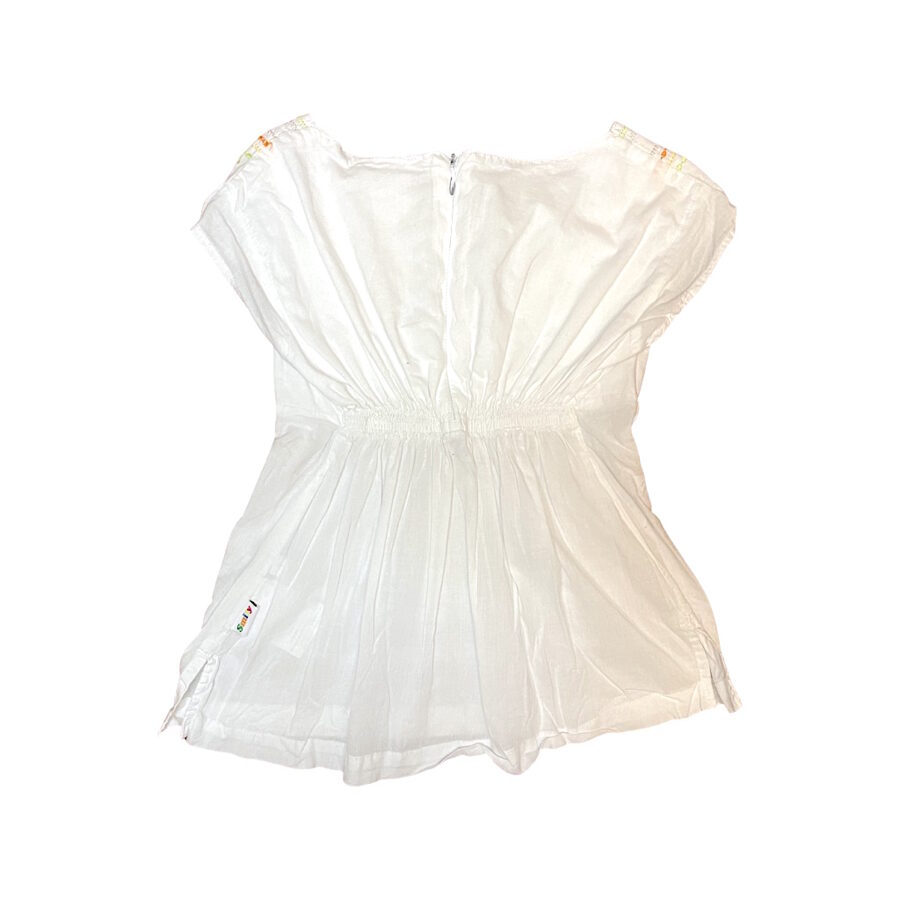 Apraksts: "Smily" firmas balta kokvilnas tunika ar izšūtiem akcentiem. Kakla daļa aizmugurē atdarināma ar rāvējslēdzēju.