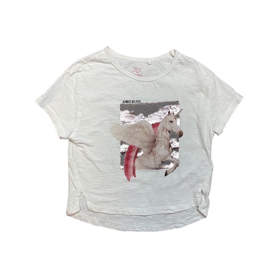 Apraksts: "Next" firmas balts kokvilnas krekls ar spīdīgu, vienradža aplikāciju.